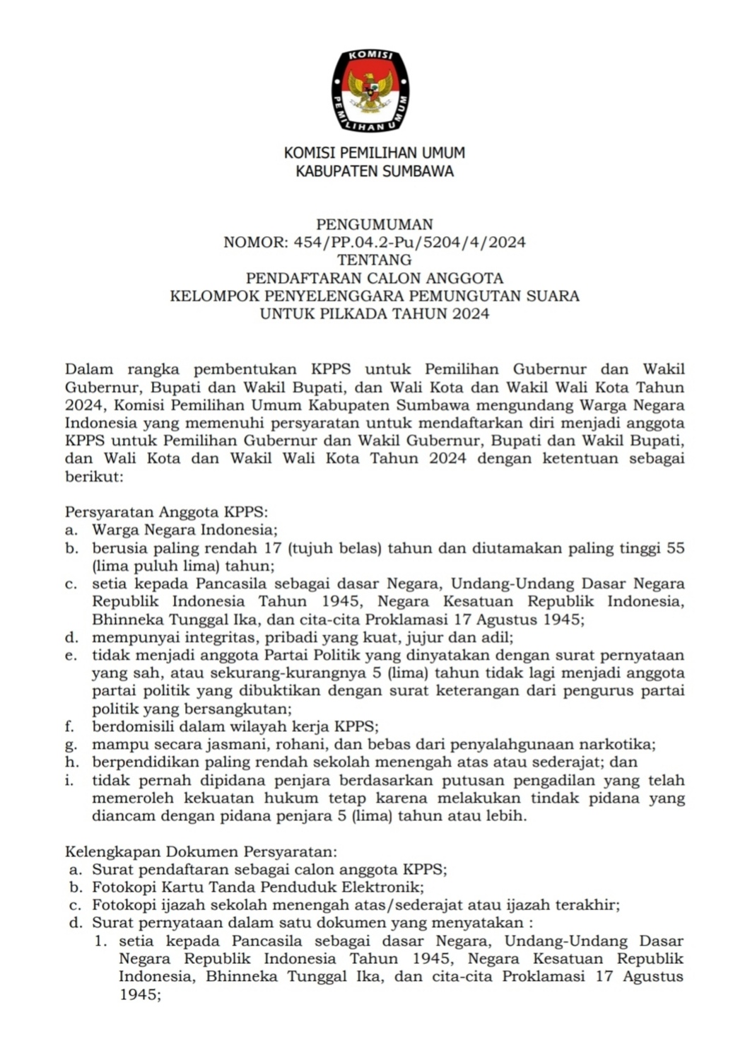 Pengumuman Pendaftaran Calon Anggota KPPS untuk Pilkada 2024 Perbesar